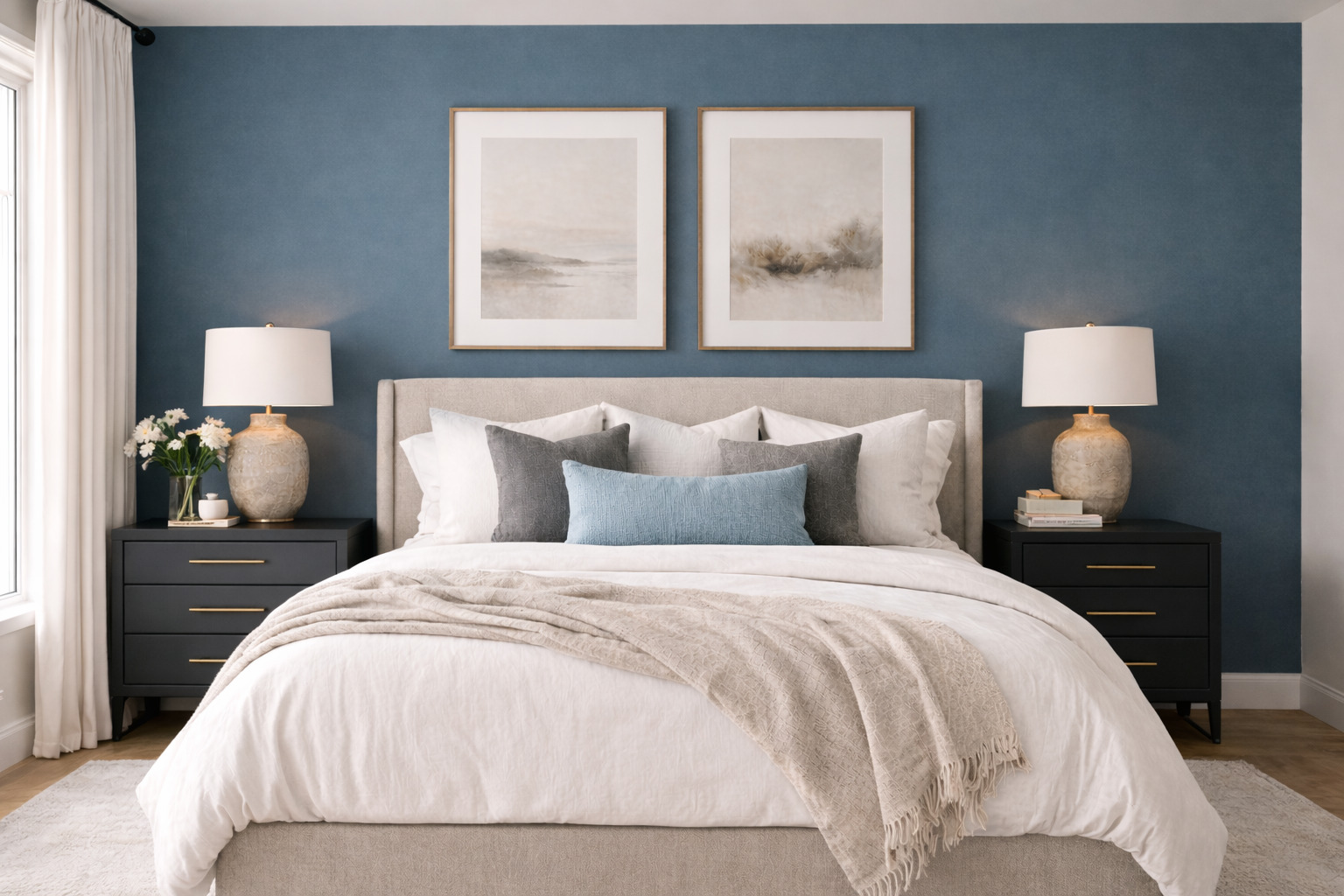 Patina Blue works best in bedrooms, bathrooms, home offices, or as an accent wall. Its muted tone adds color while maintaining a relaxed, timeless feel.